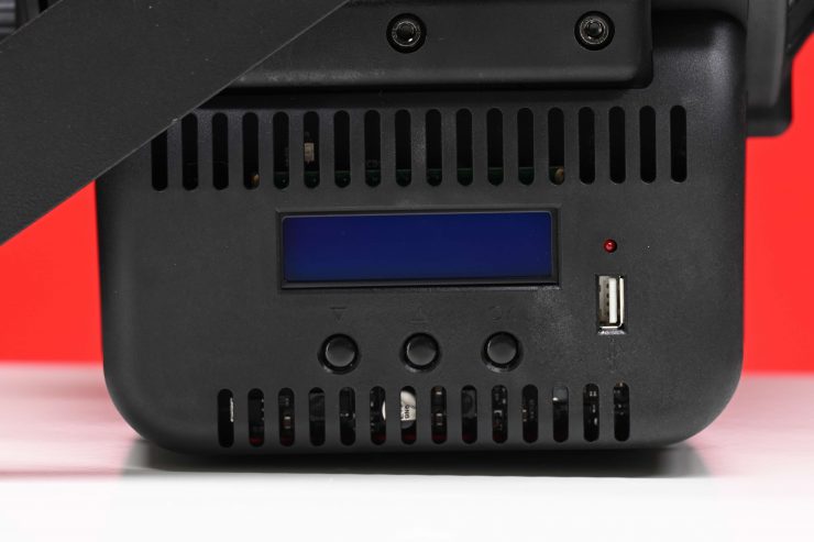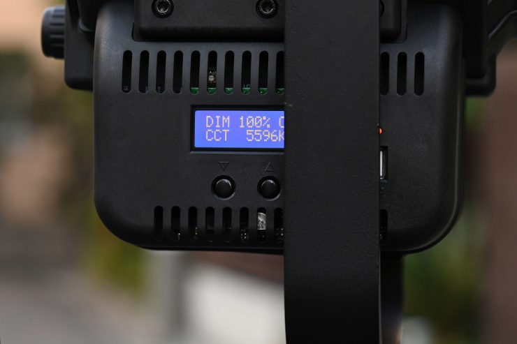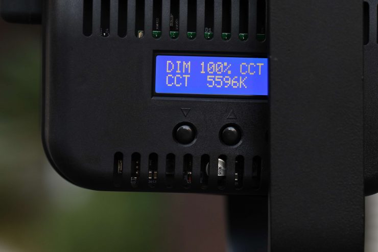 On the side of the light, you will find a small LCD display and three buttons. These buttons allow you to increase/decrease the intensity and Kelvin color temperature as well as access a basic menu.