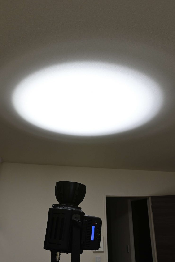 Above you can see what it looks like if it is punched directly into the ceiling using the reflector, open face, and with the Prolycht 2x Fresnel.