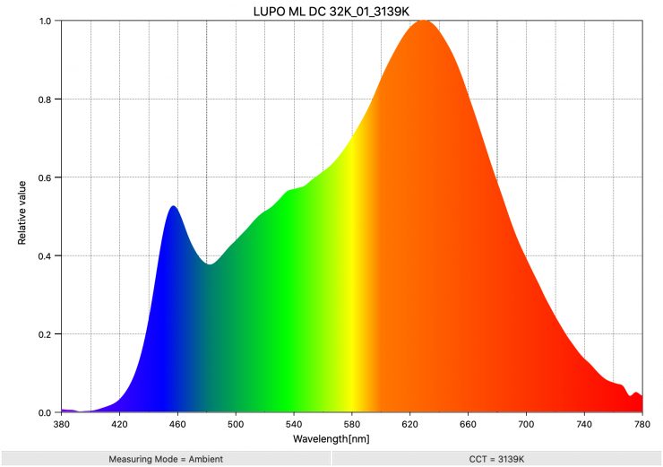 Above you can see the spectral distribution of the Lupo when used at 3200K. The spectral distribution is nice and linear, and there aren’t any spikes where there shouldn’t be.