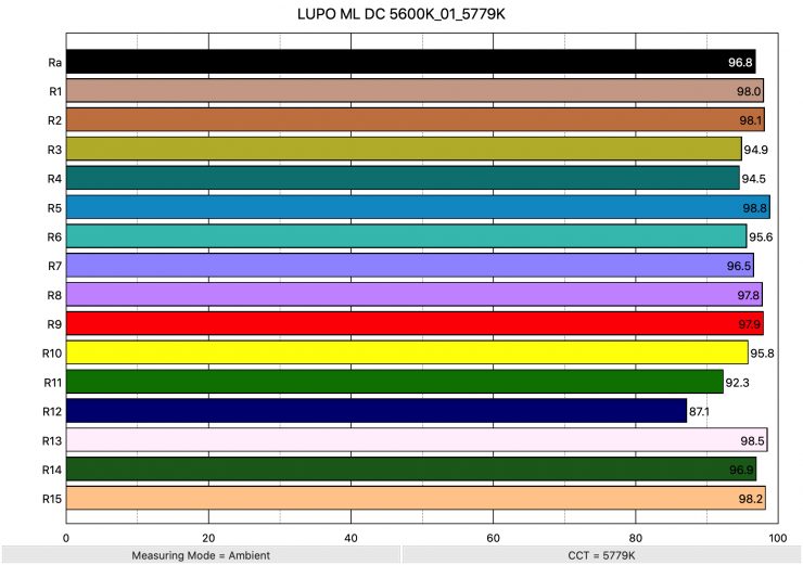 Above you can see that when the light was set at 3200K it recorded an average CRI (R1-R8) of 94.4 and an extended CRI (R1-R15) of 93.56. For replicating accurate skin tones it recorded 97.0 R9 (red), 93.4 for R13 (closest to caucasian skin tones), and 95.7 for R15 (closest to Asian skin tones). These are pretty good results, but not as good as when the light is used at 5600K.