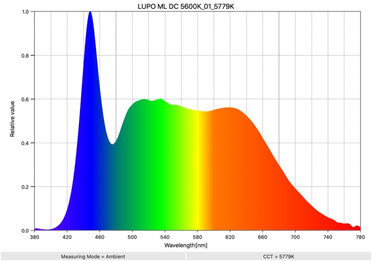 Above you can see the spectral distribution of the Lupo when used at 5600K. The spectral distribution is reasonably full, but then again this is not an RGBWW fixture.