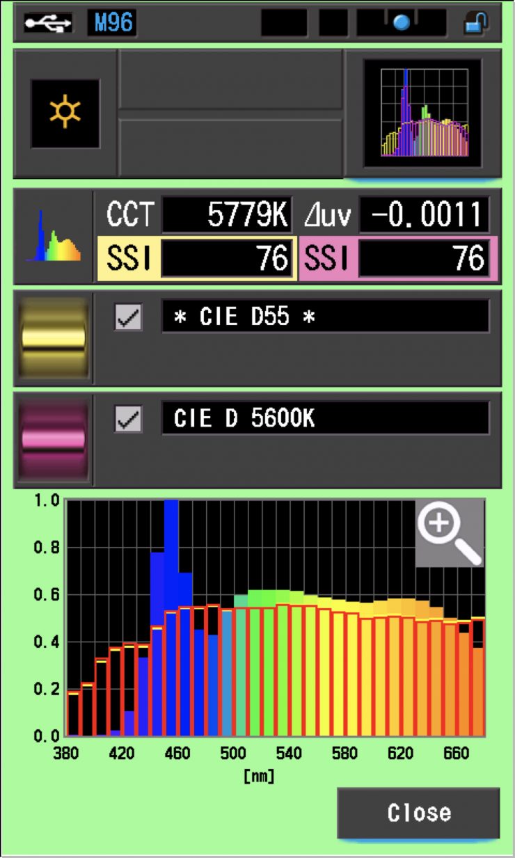 SSI (Spectral Similarity Index) was developed by the Sci-Tech Council of the Academy. SSI gives me the ability to set any light as a standard, or use predefined standards (such as CIE D55), and then give other lights an SSI score based upon how well they will match standards such as CIE D55 measure spectral response and compare it directly against an ideal light source.