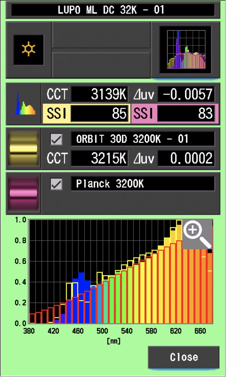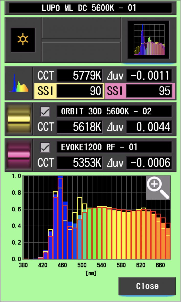 The main reason we want to record SSI scores is so we can see how well they match with other lights. I was curious to see how well the Lupo Movielight 300 Dual Color PRO matched the ARRI Orbiter and the Nanlux Evoke 1200. Below you can see the results.