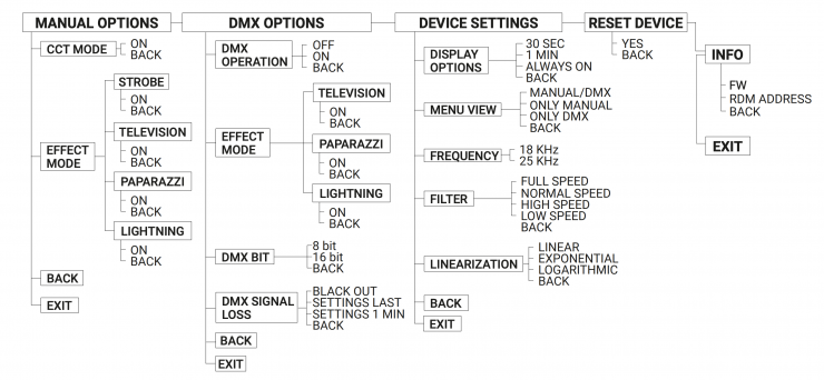 Above you can see a full diagram of all of the available options that are accessible in the menu.