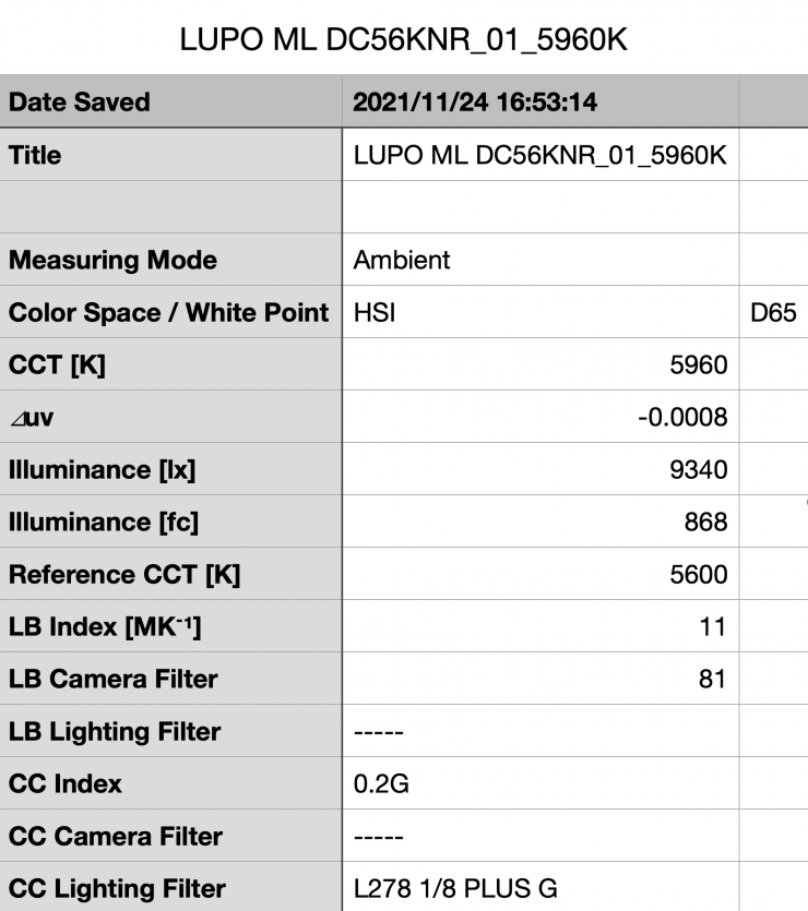 Above you can see the Lupo Movielight 300 Dual Color PRO when used at 5600K without its reflector recorded an output of 9340 lx / 868 (fc). This was 67.3% less output than it produced when using the reflector. Lupo states that the light should have 12,500lx at a distance of 1m when used open face. My reading was considerably less than that figure, however, Lupo may have been measuring 1m from the actual COB and not the edge of the fixture.