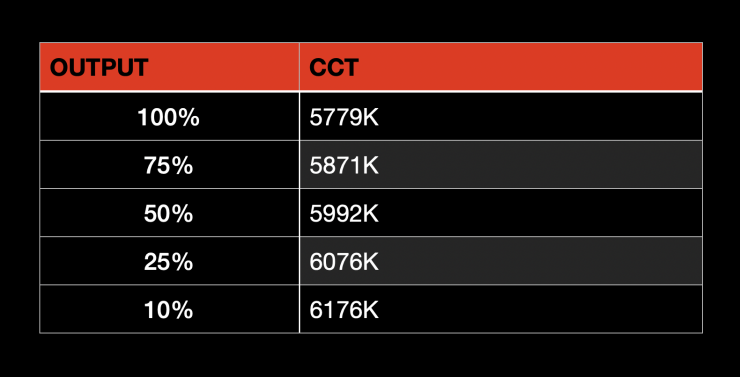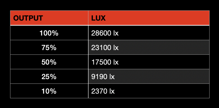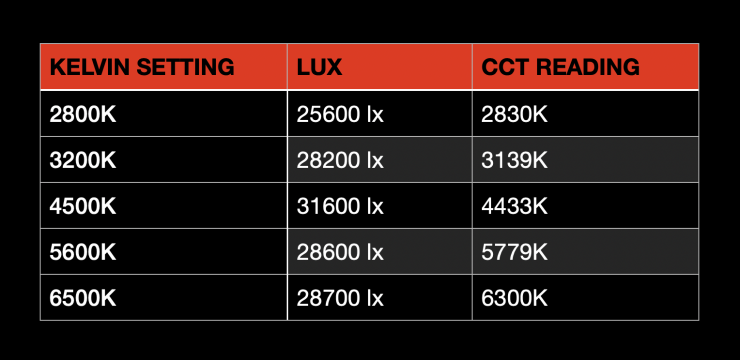 A big factor for a lot of people when buying a light is how much output it can produce. I tested the lights output at a variety of Kelvin color temperatures using a Sekonic C-800 at a distance of 1m (3.28ft) in a controlled environment