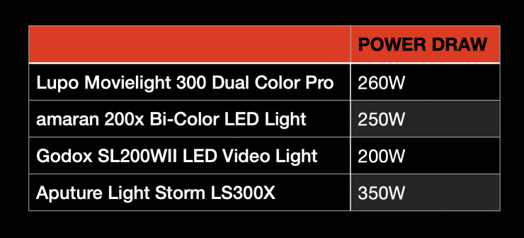 The Movielight 300 Dual Color PRO uses a 200W COB LED spotlight and it has a maximum power draw of 260W.