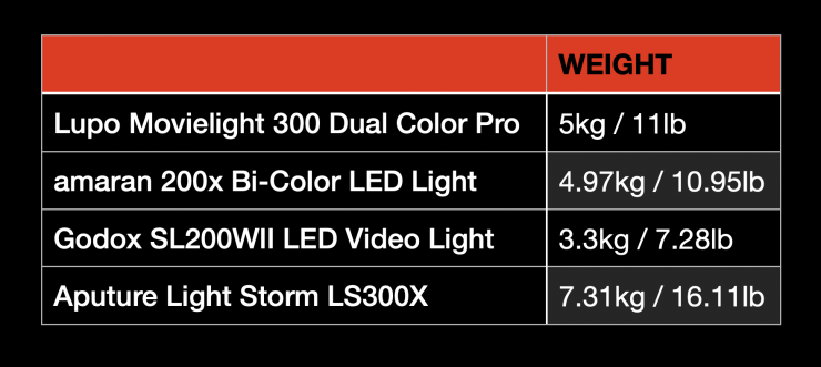 As you can see, the weight of the Lupo is very similar to that of the amaran 200x, but quite a bit lighter than the Aputure 300X.