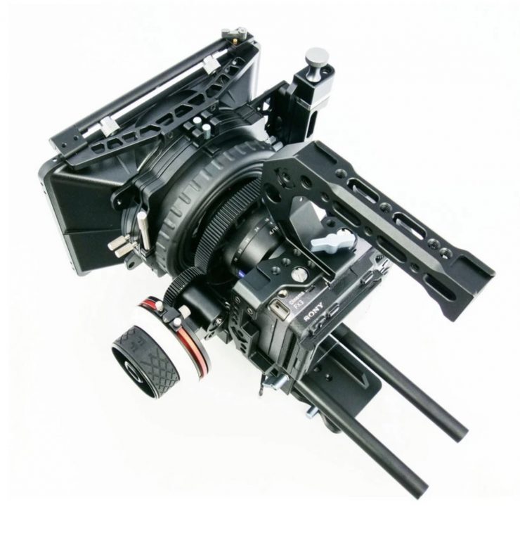 The FX3-04 kit comes with just about everything you need. In addition to the basic camera cage you get a top handle, 15mm baseplate, 15mm rods, a dovetail plate, a follow focus that attaches to 15mm rods, focus gear rings, and a swing-away matte box that accepts 4 x 4 filters.