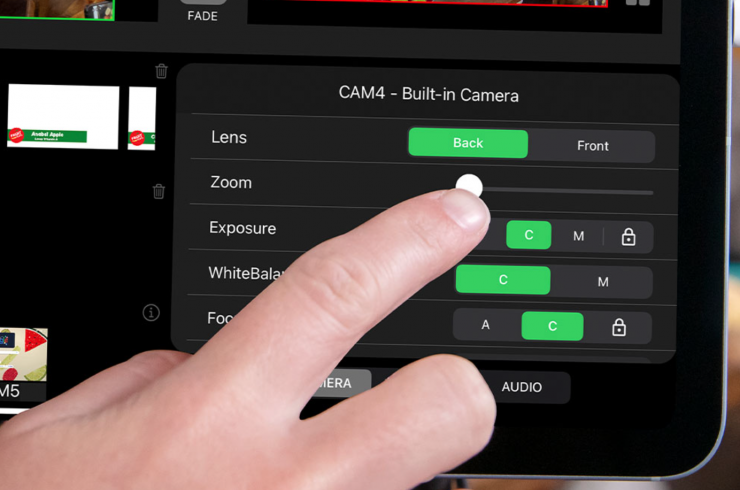 AeroCaster lets users switch wireless camera feeds from smartphones and tablets, plus screen shares from computers and mobile devices. The system supports up to four wireless devices at once, along with the camera on the host iPad. You can also add graphics, titles, video clips, photos, and more.