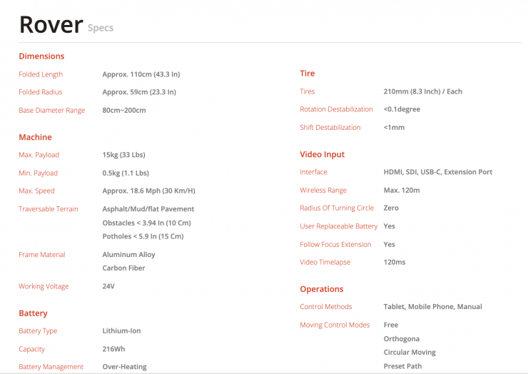 It has a claimed payload capacity of 15kg / 33 lbs. What you need to take into account is that you have to use a tripod with this product and if you plan on using a tripod that is suitable for mid to larger-sized digital cinema cameras, then you the weight will quickly add up. What also concerns me is that there doesn’t seem to be any locking mechanism for where the tripod attaches to the Rover.