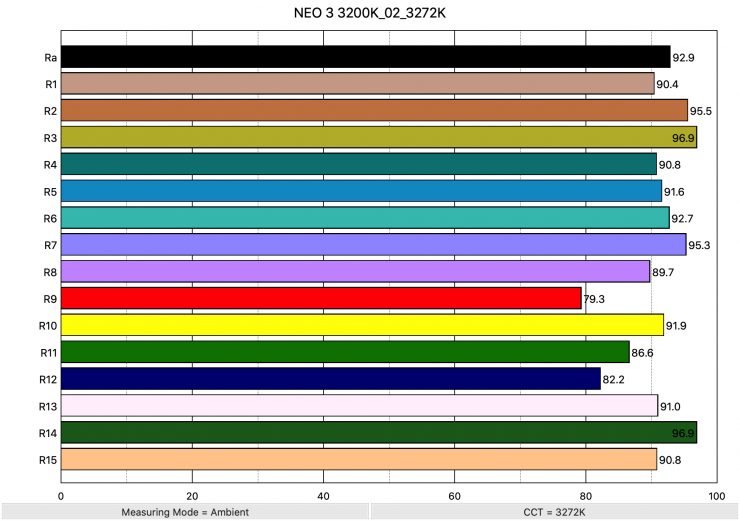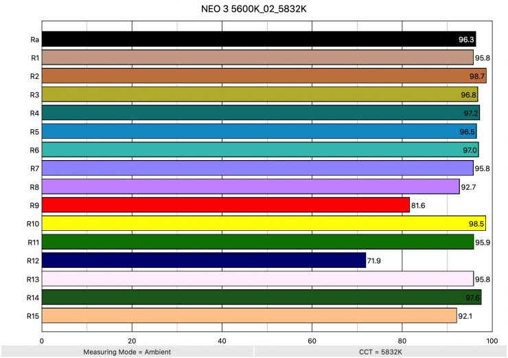In the graph above the gold bars indicate a perfect CIE D55 source. The red bars indicate a perfect CIE D 5600K source. A score in the low to mid 70’s is good for a 5600K LED source. The NEO 3 scored 70.