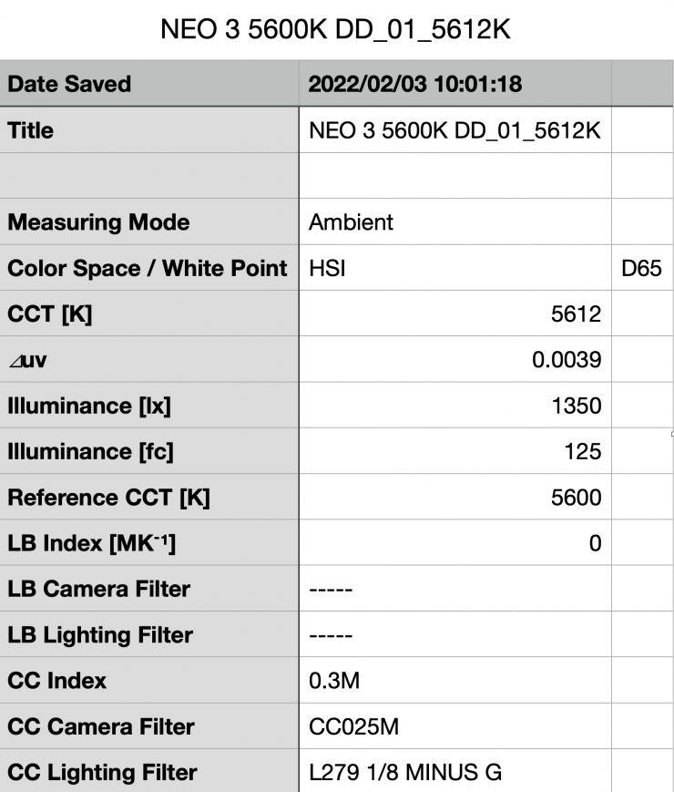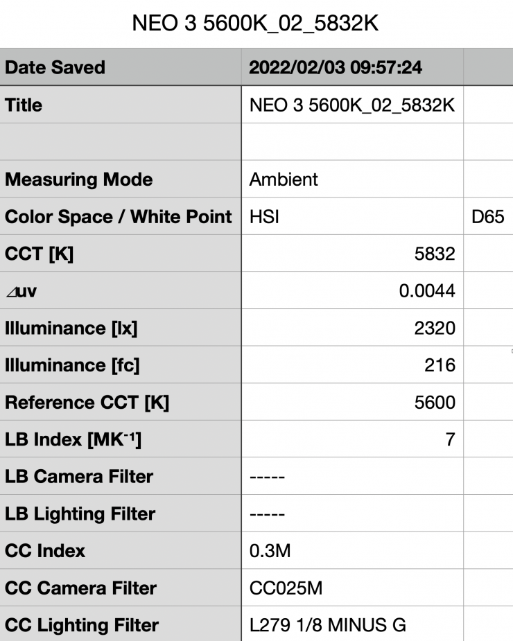 The main reason we want to record SSI scores is so we can see how well they match with other lights. As an example, let’s see how well it matches with an ARRI Orbiter and Luxli’s Cello². Above you can see the results at 3200K and 5600K. As you can see, the NEO 3 matched reasonably well with the Cello², but not so well with the ARRI Orbiter.