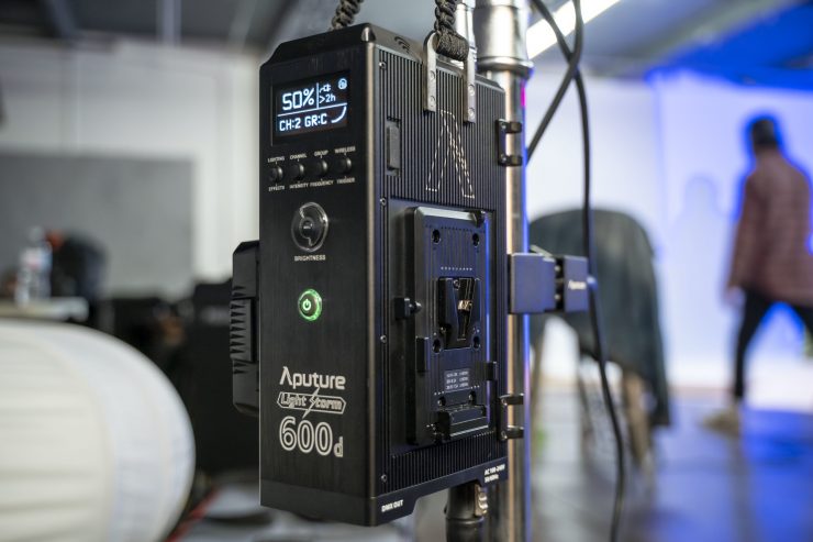 You still get two battery slots and the Aputure clamp for mounting to a stand, and the feature for using batteries for 50% output or 48V DC power source with the input on the bottom. Just like the Pro model, the inputs are on the bottom, with the main output to the lamp head on top. I was not too fond of the bottom placement as you have to lay it on its side if using AC and DMX. I get it’s a real estate issue and in order to keep it compact, it makes sense.