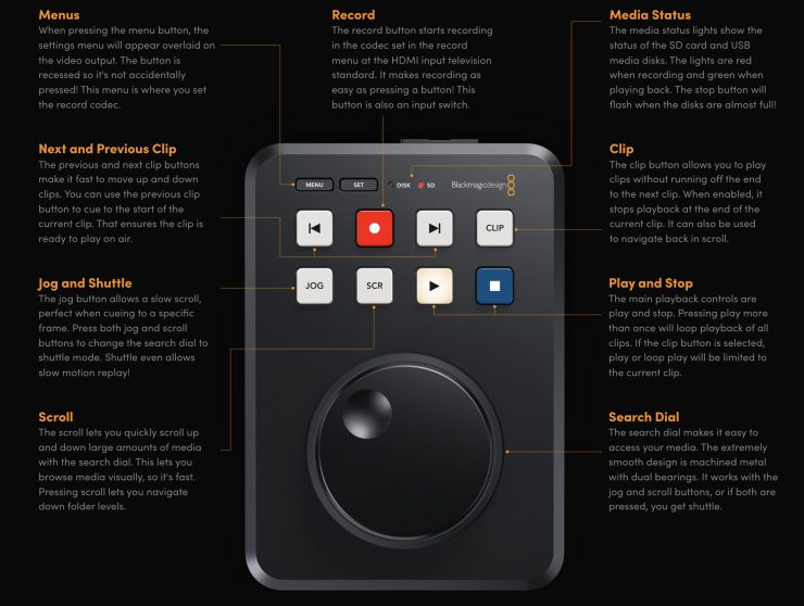 There is a large search dial for scrolling through lots of media to find the clip you want to play. You also get support for ProRes, DNx and H.264 files in NTSC, PAL, 720p and 1080p video formats. The HDMI connections allow connection to switchers, cameras and monitors. Plus SD cards, UHS-II cards and USB-C external disks can be used for recording and playing media. HyperDeck Shuttle HD uses the same design as ATEM Mini Extreme, so it’s a perfect combination to use as a media player. It even features a built-in teleprompter which looks interesting.