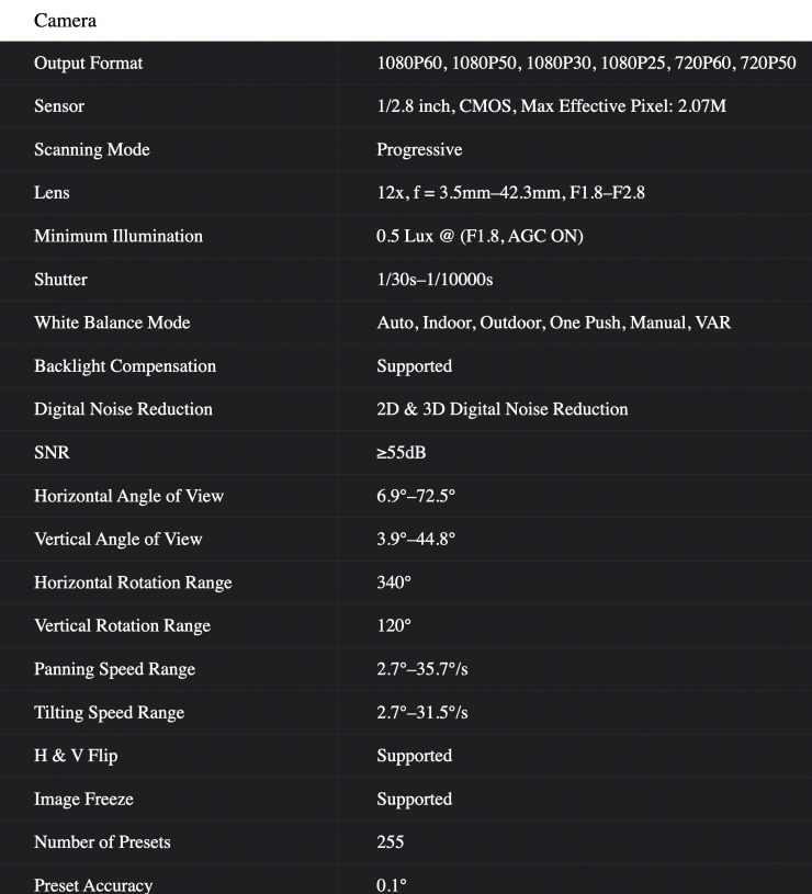 The camera features a 1/2.8″ CMOS sensor with 2.07MP effective pixels and it can stream video at up to 1080p 60 fps. The sensor has ultra-high 55 dB SNR that is claimed to effectively reduce image noise in low illumination. 2D and 3D noise reduction reduce noise, even in low-light conditions. Optically, the camera features a 72.5° wide angle lens with 12x optical zoom. A 3.5mm audio input allows for microphone or line-level integration.