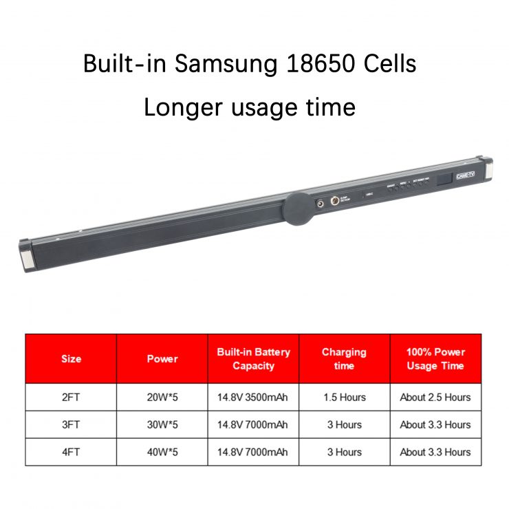 The Andromeda MKII is powered via internal Samsung 18650 batteries that can be charged via the included wall adapter. The tubes can also be run via a camera battery using the optional D-Tap cable.