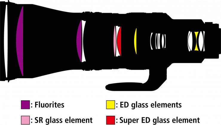 The optical formula incorporates three ED, a super ED, two fluorite and two SR lens elements. Various aberrations including chromatic aberration are claimed to be effectively compensated. Additionally, the close-up performance has been greatly improved, minimizing color bleeding from infinity to close distances, despite being a super-telephoto lens.