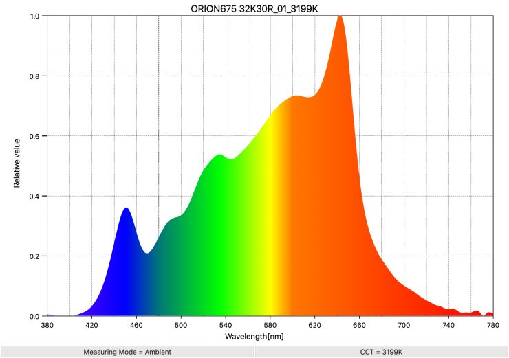 Above you can see the spectral distribution of the Orion 675 FS when it is set at 3200K. The spectral distribution only has a very marginal push towards green, but overall it is reasonably good.
