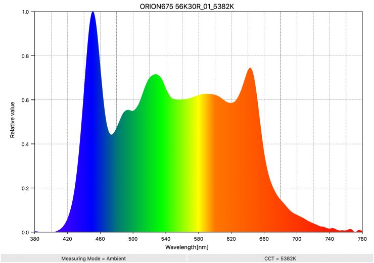 Above you can see the spectral distribution of the Orion 675 FS when it is set at 5600K. The spectral distribution is reasonably full, but you can see a few spikes.