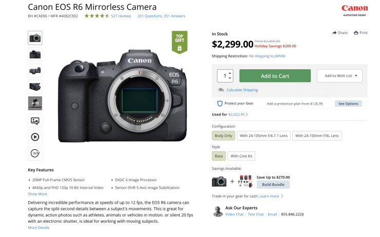 The Canon EOS R6 is on sale for $2,299 USD which is a saving of $200 USD.