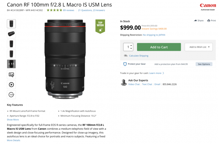 The Canon RF 100mm f/2.8 L macro IS lens is on sale for $999 USD which is a saving of $400 USD.