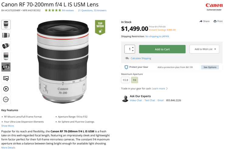 The canon RF 70-200mm f/4 L IS USM lens is on sale for $1,499 USD which is a saving of $300 USD.