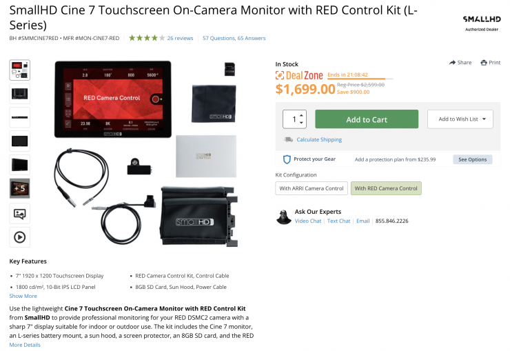 SmallHD Cine 7 Touchscreen On-Camera Monitor with RED Control Kit (L-Series) is on sale for $1,699 USD which is a saving of $900 USD.