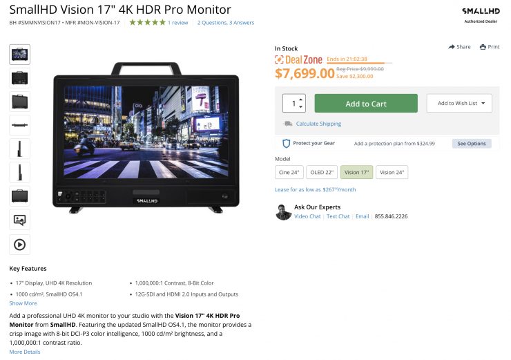 The SmallHD Vision 17″ 4K HDR Pro Monitor is on sale for $7,699 USD which is a saving of $2,300 USD.