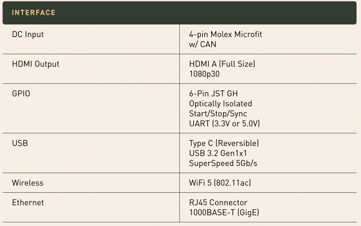 The EMBER can be powered via a 12-26V source through a 4-pin Molex Microfit w/ CAN and the camera itself draws a maximum of 40W while recording.