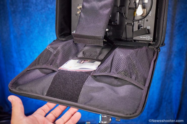 The back panel needs to open if you use a battery on the back to power the Megamon 15. In the picture, you can see this isn’t an ideal way to do it, making it very awkward. Instead, taking the velcro support off and zipping the back panel up a bit will allow the panel to be more compact and also give you access to the inputs. You could also have the panel flop fully open, but you will need to remove any accessories from the mesh pockets, or the contents will fall out.