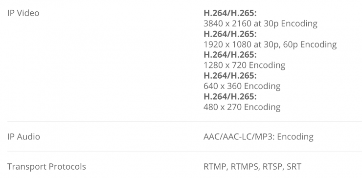 It supports H.264/H.265 and SRT streaming to servers and social media sites such as Facebook, YouTube, or Twitter using RTMP/RTMPS/RTSP and SRT protocols.