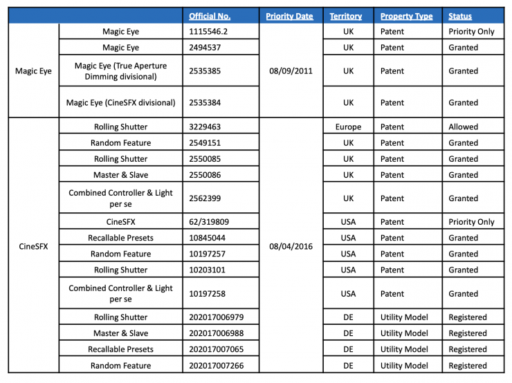 Rotolight also stated the CineSFX® and related Magic Eye® patent family contain 18 granted patents relating to user-customizable special effects, which have been thoroughly and independently examined and granted by respective patent offices in the US, UK, Germany, and Europe. These patents were developed internally by Rotolight, working in conjunction with Emmy® winning Visual FX Veteran Stefan Lange (IMDB), a listed co-inventor of these patents. Rotolight’s patents have since been cited as state-of-the-art in recent patent filings by Apple, Panasonic, and Signify (Philips), amongst several others.