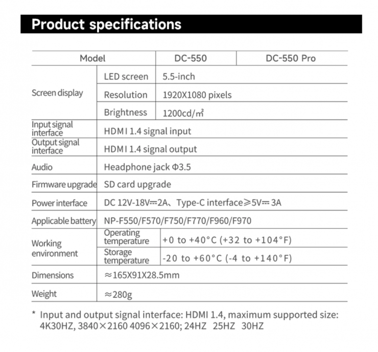 The DC-550 Pro and DC-550 can be powered via an onboard NP-F battery, through USB-C, or a DC adapter.