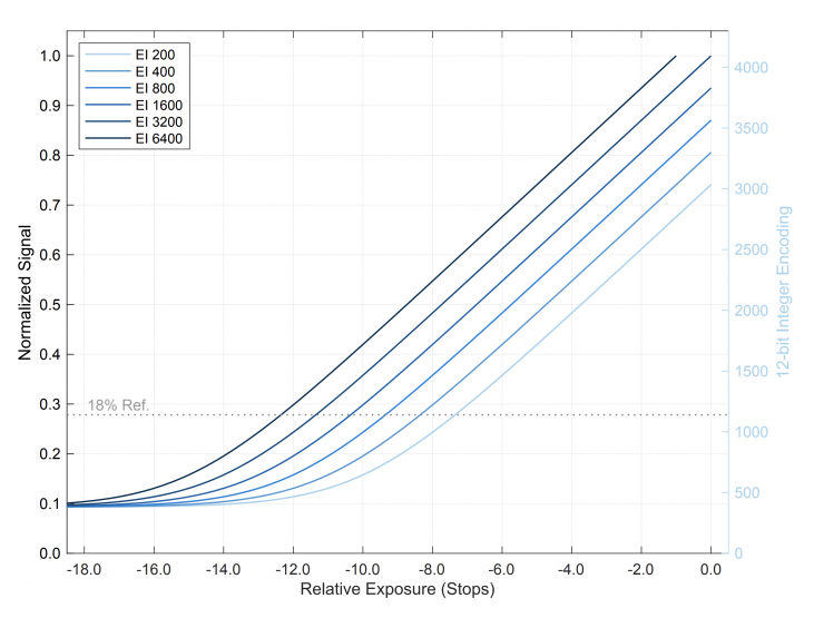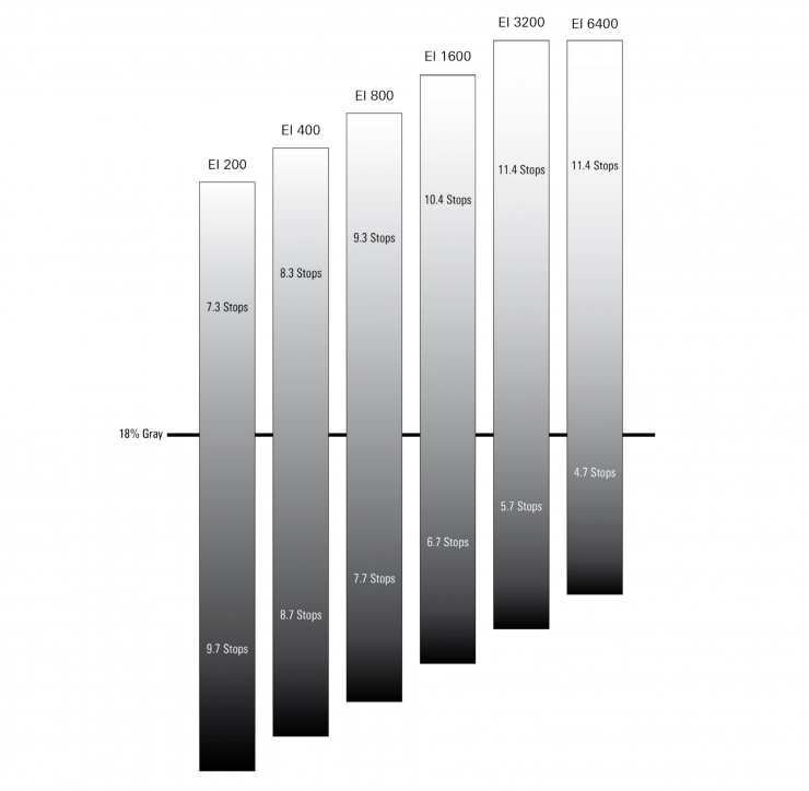 If we go to another extreme we can look at how the camera behaves at a very low EI setting of 200. Here, you get 7.3 stops above middle grey. This is almost comical because there are a lot of cameras on the market where even if you shoot as their base ISO you won’t see 7.3 stops above middle grey.