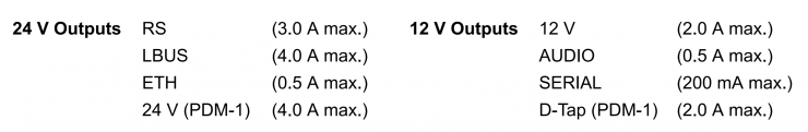 | Power Input | 20.5V – 33.6V RS Regulated 24V accessory power out 12V Regulated 12V accessory power out |