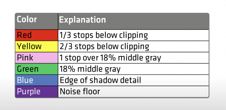 When a gray card is used (or another object in the scene with a similar reflectance level), the exposure can be set such that the card is in the green zone. At the same time, the purple and red zones will indicate when the limits of the sensor are exceeded. There is a subtle difference between the purple and red zones. I use false colors all the time to determine optimum exposure. Not only are false colors a good way of seeing what is being clipped and where middle grey should fall, but they are also very helpful in seeing how much contrast you have in your scene.