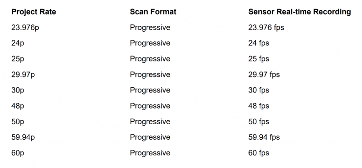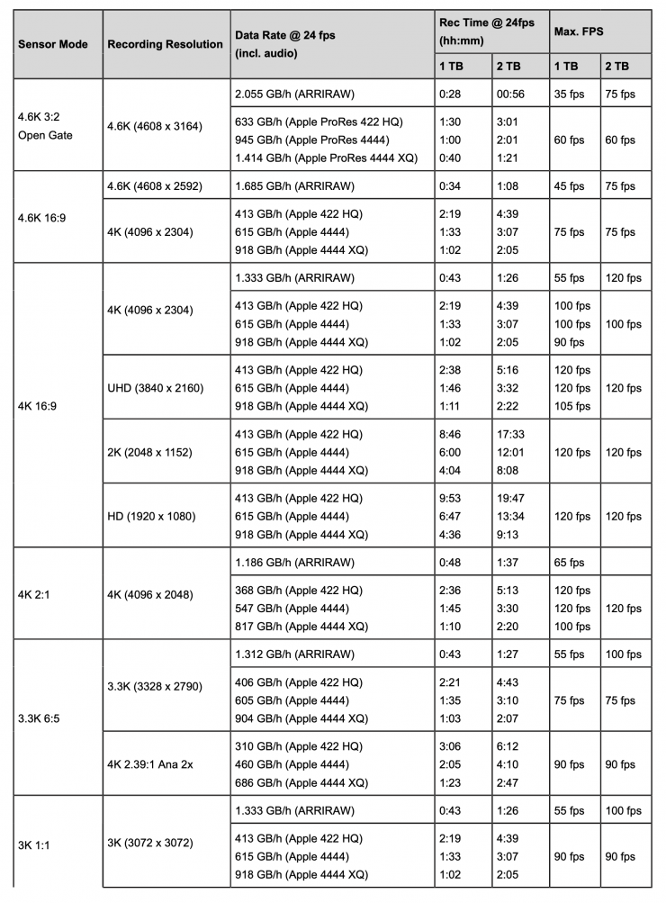| Recording Frame Rates | ARRIRAW 4.6K Open Gate: 0.75 – 75 fps 4.6K 16:9: 0.75 – 75fps 4K 2:1: 0.75 – 120fps 3.3K 6:5: 0.75- 120fps 3K 2:1: 0.75 – 100fps ProRes 4.6K Open Gate: 0.75 – 60 fps 4K: 0.75- 75fps 4K 2.39:1 2x Ana: 0.75 – 90fps UHD 16:9: 0.75 – 120fps UHD 16:9 2x Ana: 0.75 – 100fps 3.8K 2:1 2x Ana: 0.75 – 100fps 3.3K: 0.75 – 3K: 0.75 – 90fps 2K: 0.75 – 120fps HD: 0.75 – 120 fps |