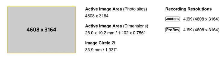 | Sensor Active Image Area (dimensions) | ARRIRAW 4.6K 3:2 Open Gate : 27.99 mm x 19.22 mm (Ø 33.96 mm) 4.6K 16:9: 27.99 mm x 15.75 mm (Ø 32.12 mm) 4K 16:9: 24.88 mm x 14.00 mm (Ø 28.55 mm) 4K 2:1: 24.88 mm x 12.44 mm (Ø 27.82 mm) 3.3K 6:5: 20.22 mm x 16.95 mm (Ø 26.38 mm) 3K 1:1: 18.66 mm x 18.66 mm (Ø 26.39 mm) ProRes 4.6K 3:2 Open Gate: 27.99 mm x 19.22 mm (Ø 33.96 mm) 4.6K 16:9: 27.99 mm x 15.75 mm (Ø 32.12 mm) 4K 16:9 Sensor Mode- 4K: 24.88 mm x 14.00 mm (Ø 28.55 mm) 4K 16:9 Sensor Mode- UHD: 24.88 mm x 14.00 mm (Ø 28.55 mm) 4K 16:9 Sensor Mode- 2K: 24.88 mm x 14.00 mm (Ø 28.55 mm) 4K 16:9 Sensor Mode- HD: 24.88 mm x 14.00 mm (Ø 28.55 mm) 4K 2:1 Sensor Mode- 4K: 24.88 mm x 12.44 mm (Ø 27.82 mm) 3.3K 6:5 Sensor Mode- 3.3K: 20.22 mm x 16.95 mm (Ø 26.38 mm) 3.3K 6:5 Sensor Mode- 4K 2.39:1 2x Ana: 20.22 mm x 16.95 mm (Ø 26.38 mm) 3K 1:1 Sensor Mode- 3K: 18.66 mm x 18.66 mm (Ø 26.39 mm) 3K 1:1 Sensor Mode- 3.8K 2:1 Ana: 18.66 mm x 18.66 mm (Ø 26.39 mm) 2.7K 8:9 Sensor Mode- UHD 16:9 Ana 2x: 16.66 mm x 18.75 mm (Ø 25.08 mm) 2K 16:9 S16 Sensor Mode- 2K: 12.44 mm x 7.00 mm (Ø 14.27 mm) |