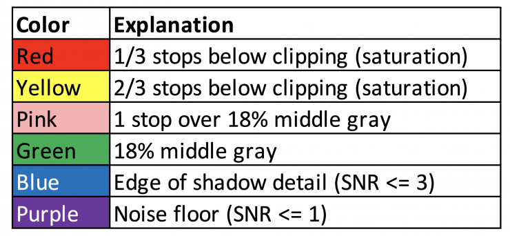 ARRI’s false color tool is a very good way to help users find the optimal exposure. The way it works is that a Log C image is converted into a grayscale image and certain signal regions are indicated in color. The first purple zone shows where the signal has an SNR of 1 or lower.