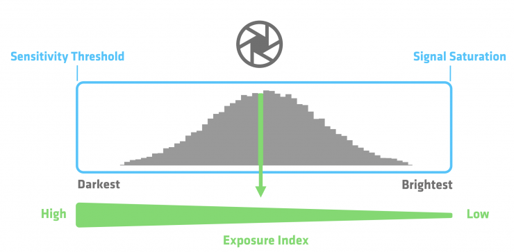The blue rectangle represents the dynamic range of the sensor, which is constant. Exposure can be controlled by the aperture, ND filter, and shutter. The combined effect of all three of these parameters is represented by the aperture symbol shown on top of the blue rectangle. The exposure changes the mapping of the tonal values in the scene to the sensor signal. The exposure index selects which sensor signal becomes middle gray in the Log C image and consequently in the monitor image. The exposure index matching the exposure is shown by the arrow that extends the middle gray line in the histogram. The value of the exposure index is inversely proportional to the exposure.