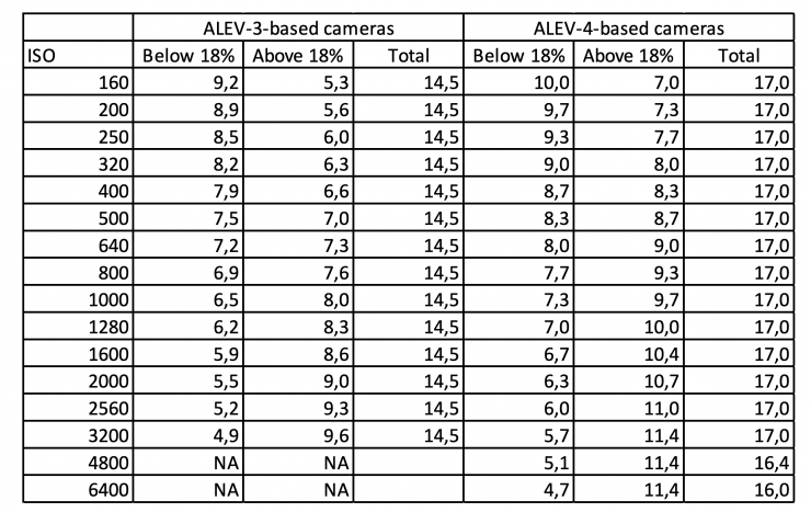 Above you can see the differences between how many stops you get above and below middle grey when comparing existing ARRI cameras that utilize the ALEV-3 sensor and the ALEXA 35 that uses the ALEV-4 sensor.