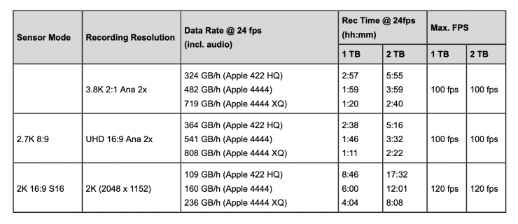 | Recording Formats | MXF/ARRIRAW MXF/Apple ProRes 4444 XQ MXF/Apple ProRes 4444 MXF/Apple ProRes 422 (HQ) |