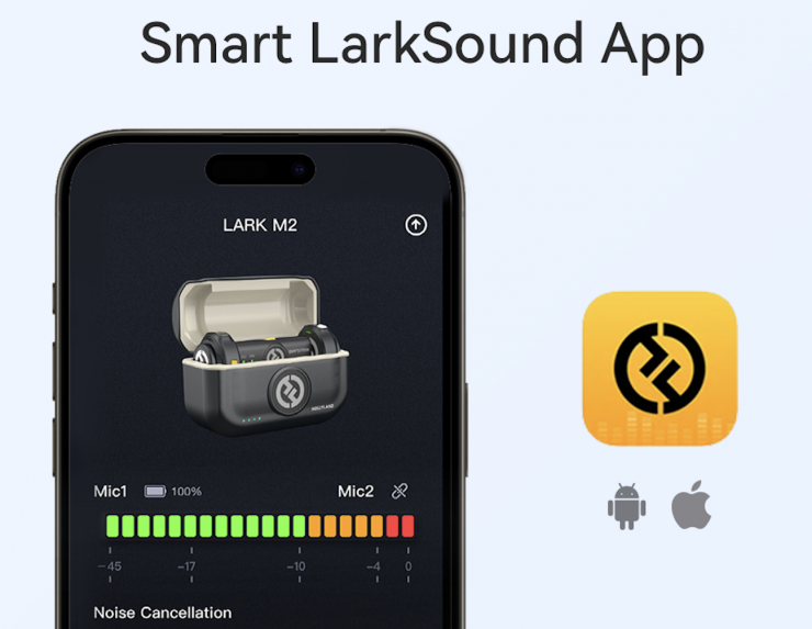 The microphone’s environmental noise cancellation (ENC) ensures more accurate sound recreation in noisy environments. Users can easily adjust ENC strength to provide the best results in any situation. The LARK M2 supports Hollyland’s user-friendly LarkSound app, which allows for one-tap firmware updates, volume and noise cancellation adjustments, and real-time audio status checking.