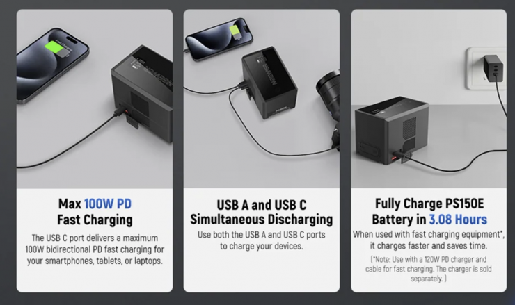 The USB-C (PD 2.0 & PD 3.0 Bi-directional) port allows users to either charge the battery via a compatible USB-C PD device or to power or charge other devices such as a laptop or phone. The USB-C port delivers 65W bidirectional PD fast charging. The USB-C port has a maximum output of 20W 3.25A.