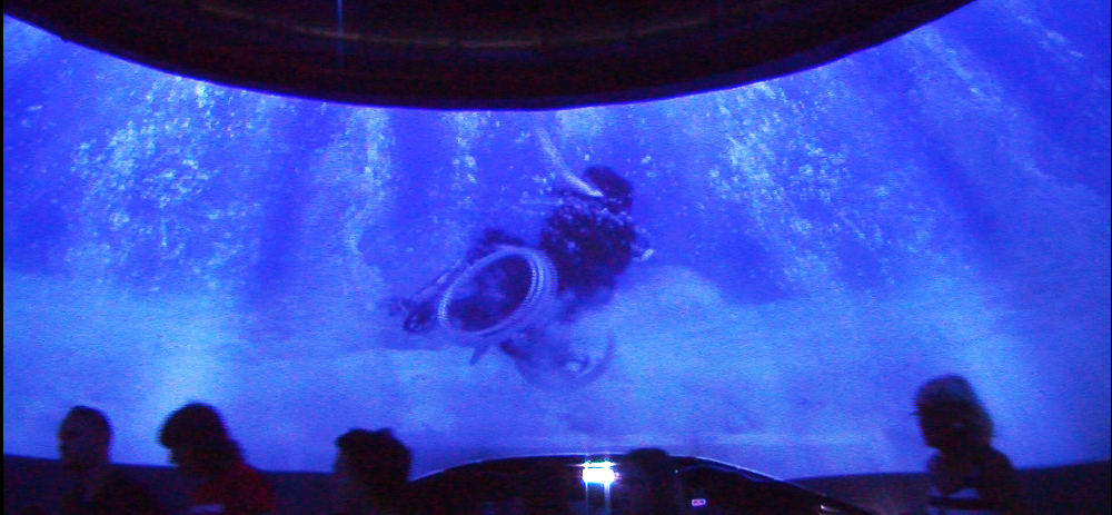 The footage from each camera was then edited by Sue and matched up in a 9600×1080 frame with a 10% overlap. This was then ‘edge blended’ using propriety software from Igloo Vision and then projected in a 360 degree Dome. The audience sat in the centre surrounded by the action.