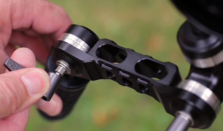 If you want to remove the camera from the rig, it’s secured with a single knob that tightens a sliding plate. You can add 15mm rails to the back of the rig so you can balance it out with weights when using a heavier camera. You can also easily attach a power solution like a v-mount plate for powering your camera and other support gear.