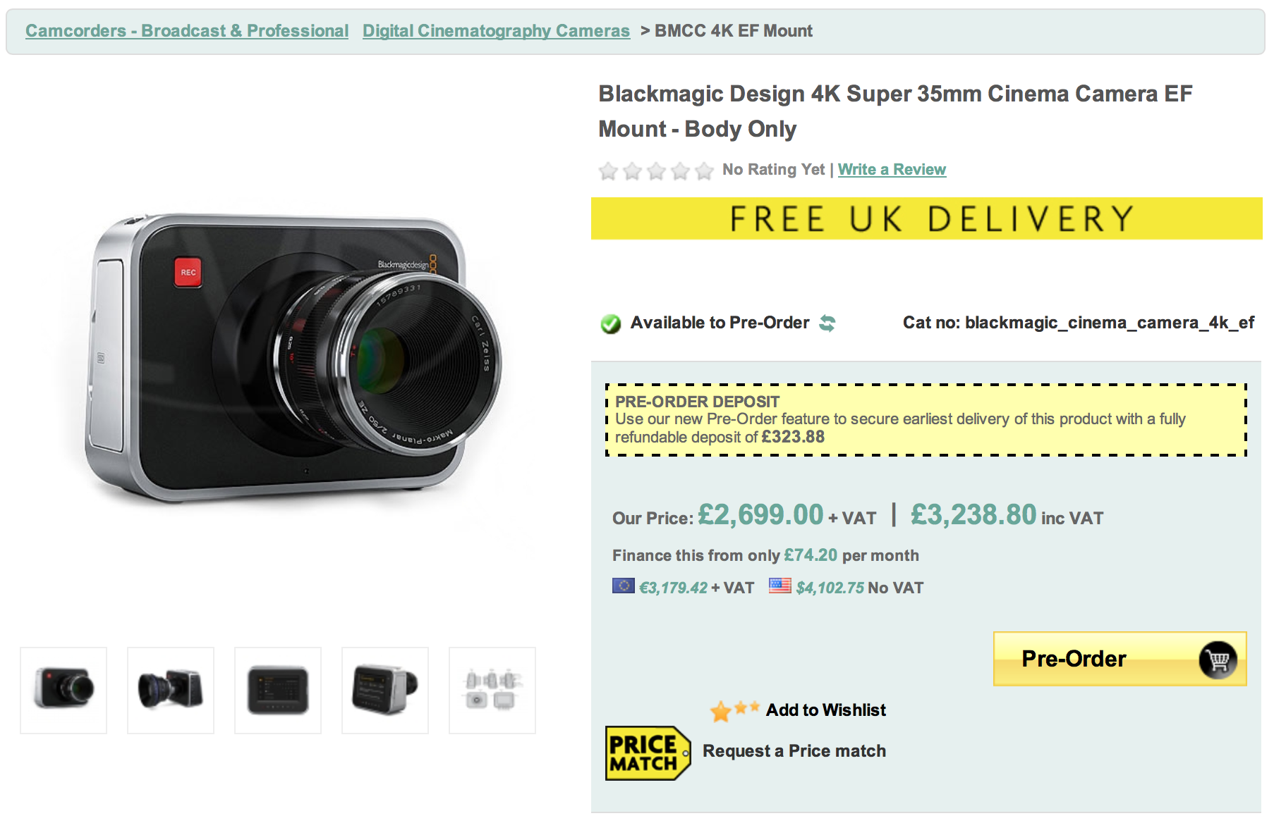 UK dealer CVP has seemingly confirmed a flurry of internet rumours that Blackmagic Design are going to announce a 4K Super35mm RAW camera for an astoundingly low cost of 2699 GBP (plus tax). Posted on their website are details that say it will shoot compressed Cinema DNG, RAW and ProRes. It will have a global shutter to eliminate rolling shutter and a built in SSD recorder. The picture appears to be of the existing BMCC camera, although internet photos seem to show the new 4K camera to be similar.