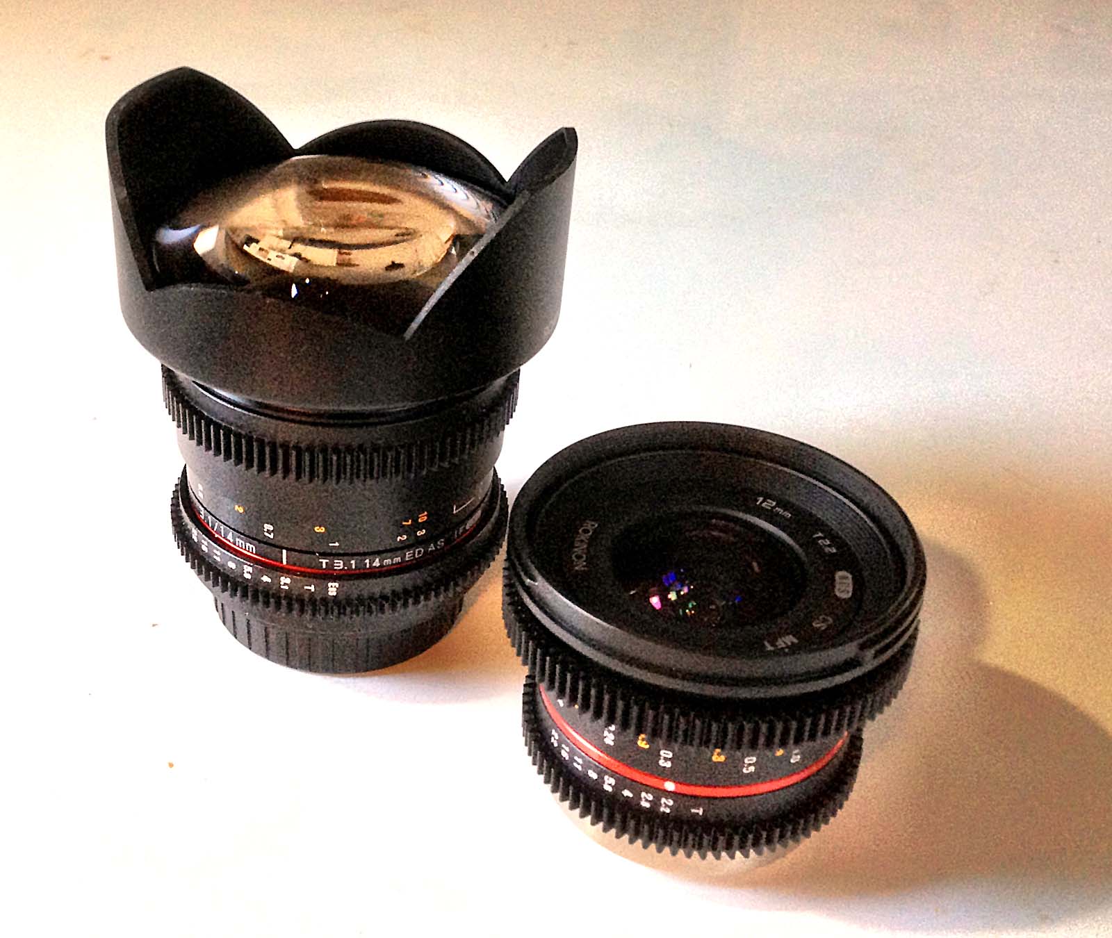The Rokinon 12mm T2.2 Cine Lens is tiny compared to the Rokinon full-frame 14mm. The 12mm keeps lines relatively straight, and it is sharp and decent for the price (US $429 from B+H) – too bad it only covers mirrorless APS-C size chips. It’s available in Micro 4/3, Sony E-Mount, Fuji X mount, Samsung NX, and Canon M mount. It has nice smooth focus and click-less aperture ring with cine style gears and the markings indexed on the left side of the lens – where you’d look at it when on a tripod at eye level. And the best part is it’s a wide angle that takes regular 67mm filters on the front so you don’t have to struggle to adapt filters to a petal front end, like you do with the Panasonic 7-14mm.