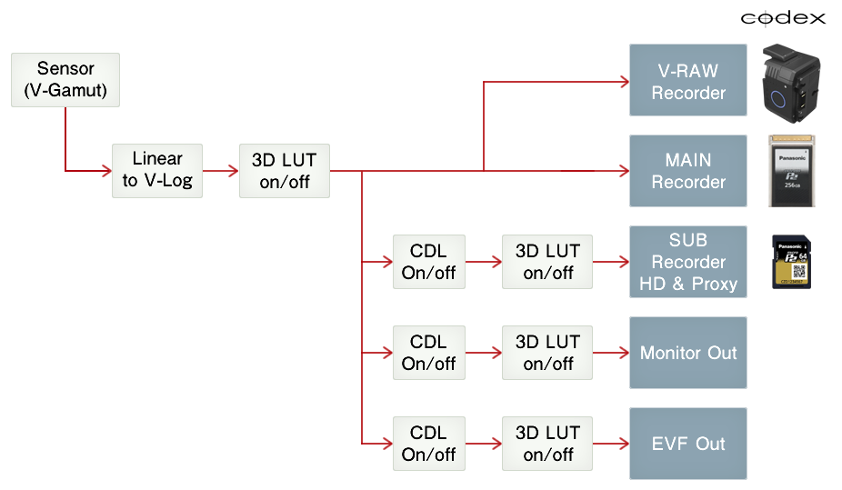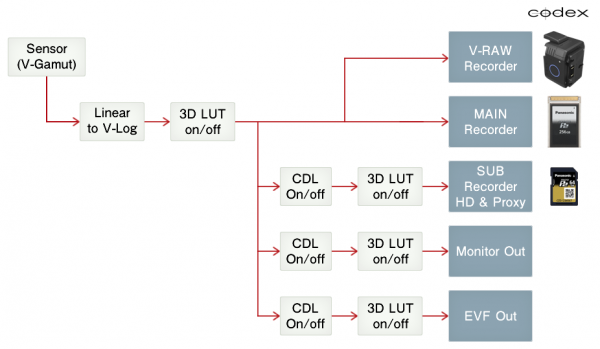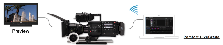 Usually on a set when you are dealing with LOG or RAW images you would have the camera output going to a DIT cart where they would put it through something like a Blackmagic HD Link and then to a computer where colour grading software would enable a “Look” to be fed back into the HD Link. Then that signal is fed out to another screen for monitoring. This solution has been used for a long time but it requires the use of lots of cables and multiple signal paths. What Panasonic has basically done it take similar technology to the HD link and put it inside the camera. Now the Varicam can send the signal wireleslly straight to the viewing monitor without using a complicated/wired signal path. A computer using the LiveGrade Pro software is used to adjust the image.